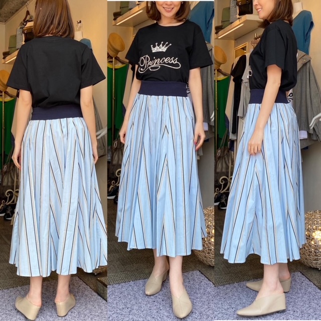 Tシャツ¥7040 スカート¥9790✨ スパンコールのクラウン👑モチーフTシャツに、ウエストゴムのスカート💛 スカートはウエストゴムで履き心地抜群✨ ストライプが爽やかです🤗 スカート綿100% Tシャツ¥7040 スカート¥9790 2021年4月8日
