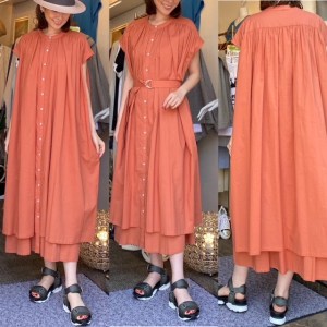 ワンピース¥14080✨ 身体のラインを拾わない、ふんわりシルエットのワンピースはいかがでしょうか🧡 ボリューミーなダブルの裾が可愛くておすすめですよー🤗✨ お色違いでグリーンもございます💚 綿100% ワンピース¥14080 2021年4月9日