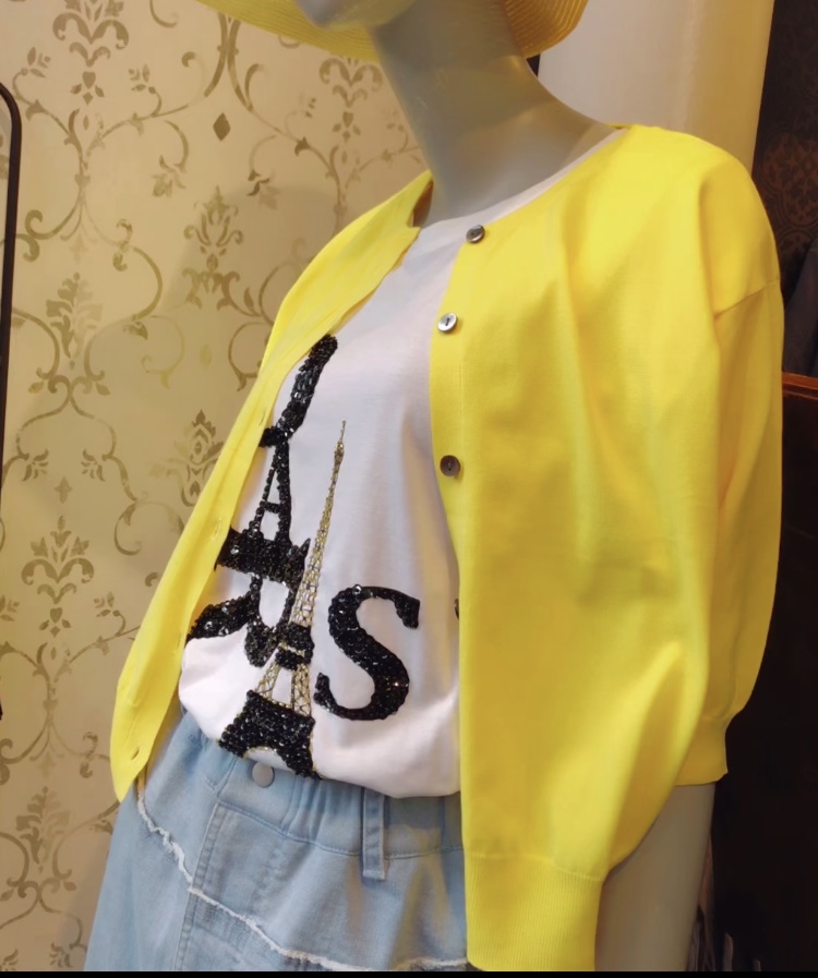 ビジュー付きのTシャツ ¥7040税込 Parisビジュー付きのTシャツと黄色のカーディガン💕 爽やかさ120%のTシャツコーデには、キュートな黄色いカーディガンがお薦めです😃 インナーには、キラキラビジューのTシャツを合わせてみました💕 大人気のビジューTは、勢揃いしている今がチャンスです💕🙌 Tシャツ ¥7040💕 カーディガン ¥9790💕 カーディガンは、白、黄色、ロイヤルブルー、サックスブルー 、ブラックなどご用意しております お気に入りを見つけにいらしてくださいね💕 2021年4月11日
