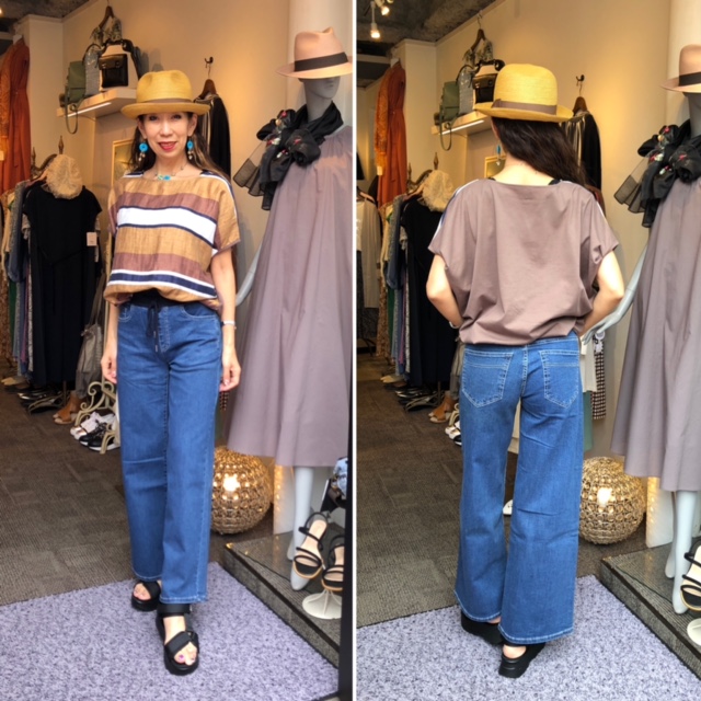 イタリア生地🇮🇹のボーダートップス💕 ブラウン❎ネイビー❎ホワイトのマルチストライプが素敵なトップスが再入荷致しました💕😃 イタリア生地🇮🇹のお洒落な質感と、日本製生地&縫製の大人トップスです 今回はデニムのワイドパンツで合わせてみました💕 デニムもこんなトップスやアクセサリーを合わせると、お出かけスタイルになりますよん⭐️⭐️⭐️👍 2021年4月26日