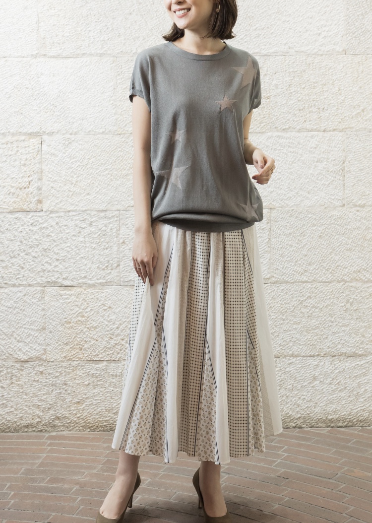 プリントフレアスカート💕 細かい幾何学プリントの生地を16枚に切り替えたとっても凝ったスカートが到着しました💕 上質な綿ローンの生地で爽やかな着心地です お色違いはシックなチャコールグレーがございます ニット ¥12100⭐️⭐️ スカート ¥14080⭐️⭐️⭐️ 2021年4月27日