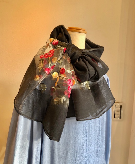 シルクストール💕 黒地に草花の刺繍が素敵な、シルク100%のストールはいかがでしょうか? オーガージーのハリのある素材も高級感があって素敵です😍 一点のみ追加で入荷致しました💕💕💕 2021年4月27日