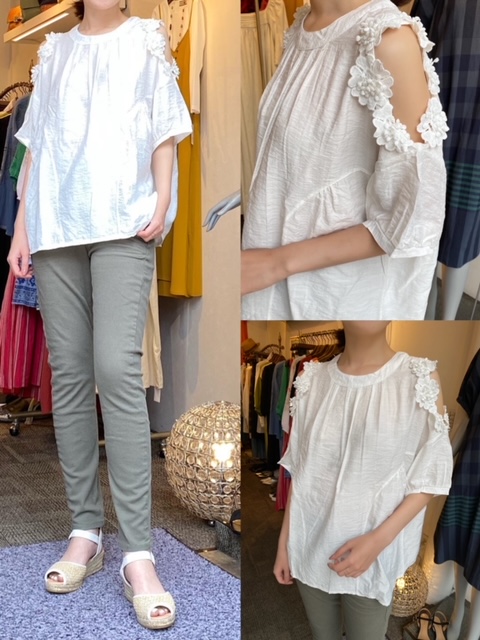 肩空きトップス6930円✨ 毎年大好評をいただいている肩空きトップス✨ 程よい肌見せが上品です😊 カラーバリエーションも豊富なので、ぜひお試しにしいらしてくださいませ💕 肩空きトップス6930円 パンツ15180円 サンダル15400円 2021年5月7日