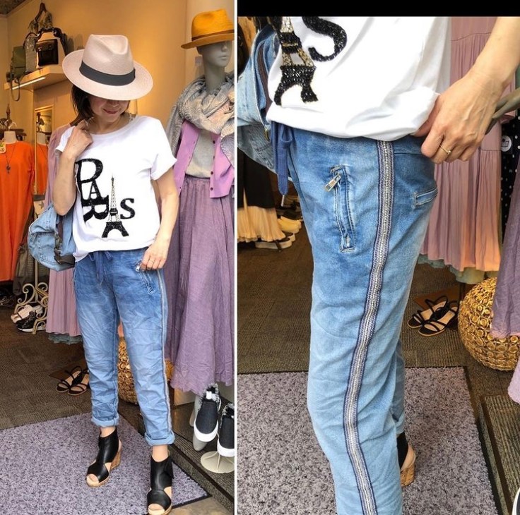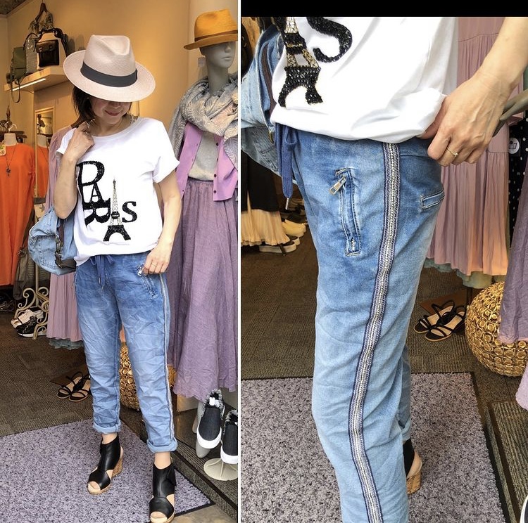 サイドラインデニム🇮🇹 イタリアインポート サイドのキラキラが可愛いストレッチデニムがイタリアから再入荷しました💕 ソフトデニムとウェストのゴム仕様でめちゃめちゃ履きやすい⭐️⭐️⭐️ 立ったり座ったりしてもずり落ちないデニムです😃👍 残りわずかとなりましたので、お早めにチェックされてくださいね💕 サイドラインデニム ¥11880💕 ビジューTシャツ ¥7040💕 2021年5月11日