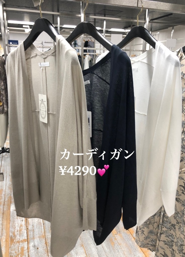 カーディガン💕 ¥4290😍 今日は雨で結構肌寒くなってしまいましたね。 いよいよ梅雨に入るので、寒さ対策の羽織物を一枚お持ちになるとお役立ちです💕 半袖や七分袖でもすっかり着られる、アーム周りが緩めのカーディガンなら、ストレス無く着られて快適です👍⭐️⭐️⭐️ 更にこちらのカーディガンは、UV機能も付いていて、日焼け対策にも有効💕 サラッとしていて着心地もGOOD💕 売り切れ必至ですので、お早めにチェックしてくださいね ライトグレー、ネイビー、オフ白の3カラーで展開しております。 2021年5月13日