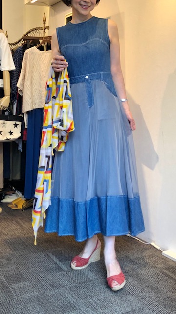 デニム❎チュールのワンピース💕 こちらはとっても着心地の良いデニムとチュールのドッキングワンピースです💕 しっかりと肩幅があるので華奢に見せてくれるのが嬉しい😍⭐️ 真夏にも対応できる軽いデニム素材がGOOD💕 デニムワンピース ¥12980😍 ストール ¥6490 サンダル ¥17600 2021年5月13日