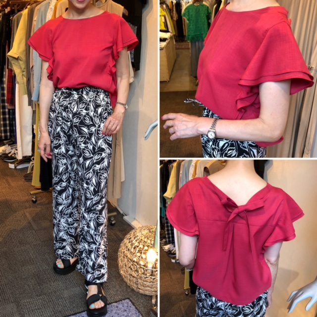 バックリボンブラウス💕 麻調ポリエステル素材のバックリボンブラウスが大人気です💕 しなやかな素材感で、シワになりにくいのでアイロン要らずでいつでも綺麗⭐️⭐️⭐️👍 こちらのローズピンク、グリーン、ネイビー、スミ黒、ホワイトで展開しております 今月中お買い上げのお客様に、10%オフにてお買い求め頂けます💕 とっても綺麗なカラーブラウスをぜひ一枚いかがでしょうか? ブラウス ¥9900💕5月31日までお値引き販売です パンツ ¥9790💕 サンダル ¥6050💕 2021年5月23日