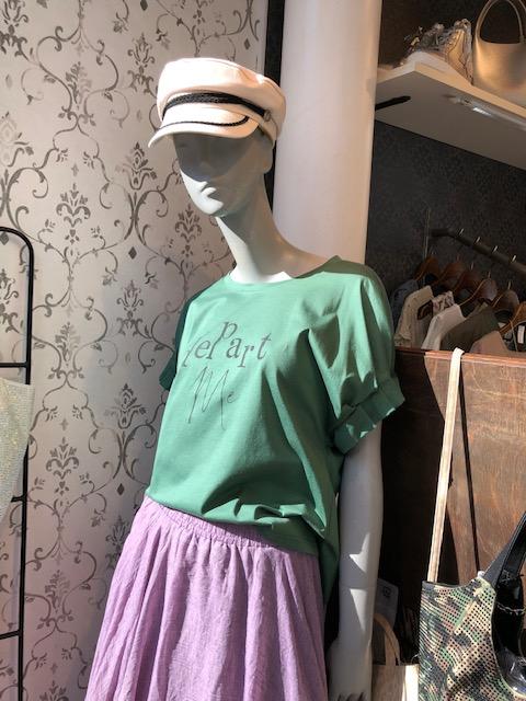 袖ふんわりトップス ¥9790💕 ラベンダーのスカートをグリーンのデザインTシャツで合わせてみました💕 いつものベーシックな色合わせに飽きたら、こんな配色もオススメです💕 初夏のお洒落楽しんでくださいね スカート ¥7700💕 2021年5月23日