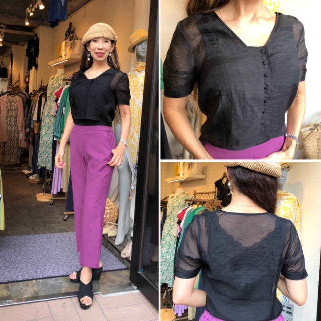シフォントップス❎カラーパンツ シアーな素材の半袖ブラウスをパープルのカラーパンツでコーディネートしてみました💕 上品でシックな組み合わせです⭐️⭐️⭐️ ほんのりクラシックなブラウスはデニムに合わせても素敵です⭐️⭐️⭐️ パンツは38.40の2サイズがございます ウェストはバックゴム仕様でとても履きやすいです💕 お色は、ビリジアングリーンもございます💕 ブラウス ¥8690 パンツ ¥12100 サンダル ¥8690 2021年6月3日