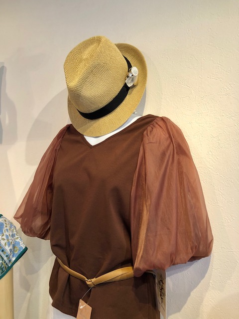 袖シフォンのトップス💕 Vネックのネックラインが女らしい💕袖シフォンのトップスのブラウンが入荷致しました💕 見頃のカットソーも、ハイクオリティなので洗っても毛羽立たず、乾いたら直ぐに気持ちよく着ていただけます💕 一足お先にブラウンのニュアンスカラーなどもおすすめです💕 帽子 ¥3190 ブローチ 別売り トップス ¥9790 ベルト 本革 ¥4290 2021年6月4日