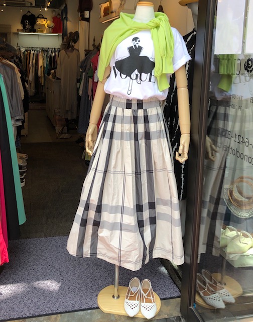 チェックスカート 💕 ¥13200 爽やかな白系のチェックスカート が到着しました💕 ポリエステルタフタ素材で、オールシーズンお使いいただけます💕 お色違いはブラックがございます💕 Tシャツ ¥5390 カーディガン ¥14300 2021年6月5日
