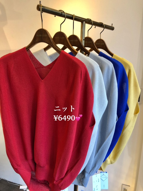Vネックニット ¥6490💕 日本製🇯🇵のホールガーメントニットです 綿ポリエステルの棍棒でご自宅で手洗いOK💕 汗をかいても速乾でいつもサラサラの着心地が嬉しい😃 とってもお薦めの商品です 2021年6月5日