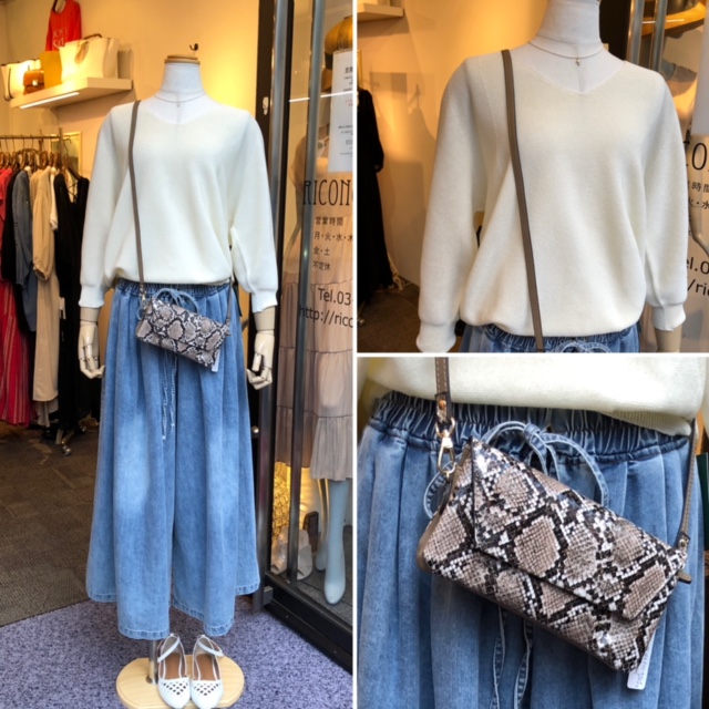 デニムワイドパンツ ¥8690💕 エイジング加工されたお洒落な夏のデニムワイドパンツが再入荷しました💕 夏はサラサラの着心地の薄手のデニムが大活躍しますよぉ〜💯 ラスト一枚の七分袖のホールガーメントニットを合わせて、王道の着こなしはいかがでしょうか? とっても爽やかで着心地が良いです💕 ニット ¥6490 パンツ ¥8690 ウォレットバック ¥6050 2021年6月8日