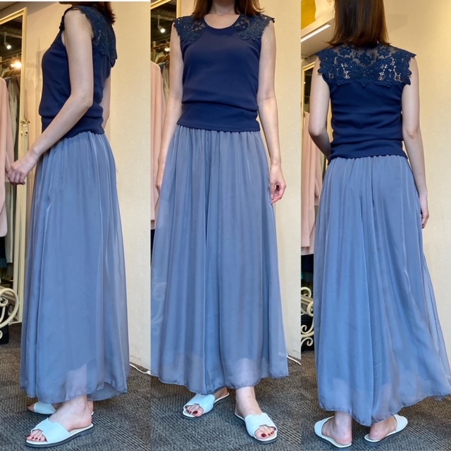トップス¥4950 パンツ¥7700✨ 大人気のレーストップスに 透け感のある涼しげなワイドパンツ✨ スカートに見えるパンツなので、動きやすくおすすめですよ😊❣️ どちらのアイテムも、お値段もお手頃になっておりますーー💕 トップス¥4950 パンツ¥7700 2021年6月12日