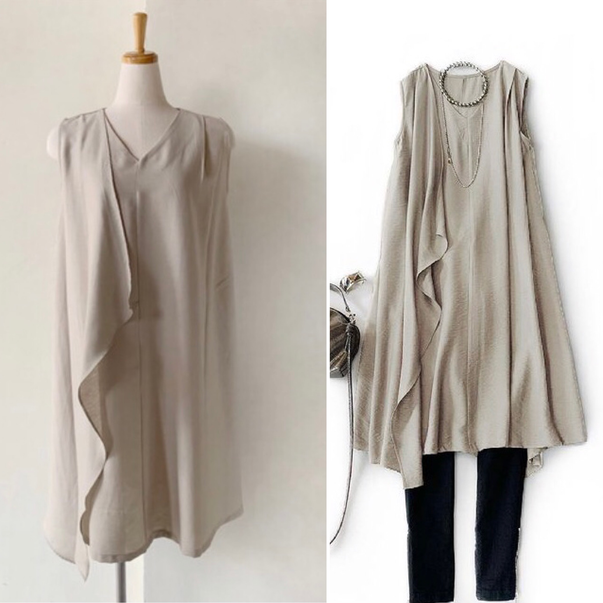 デザインチュニック💕 縦に流れるフリルが素敵なチュニックワンピースが人気です💕 麻調の合繊素材でシワになりにくく落ち感があって綺麗めな印象です😍 こちらのアイボリーの他にオレンジ、カーキ、ブラックなどございます フリル付きチュニックワンピース ¥10780💕 2021年6月15日