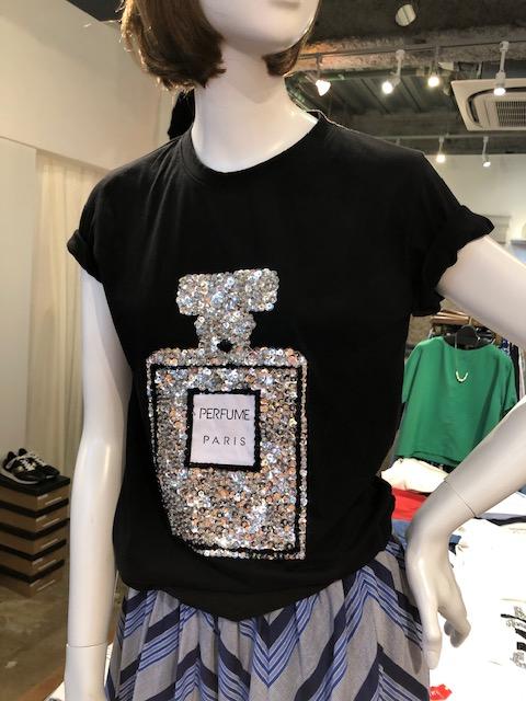 香水ボトルのビジューTシャツ😍 めちゃキュートなキラキラビジューの香水ボトルが付いたコットン素材のTシャツが到着しております💕 コンパクトなシルエットなので、スカートやワイドパンツにもバランス良く着られます 裏返しにしていただいて、弱水流でのお洗濯もOK🙆♀️ 毎日お役たちのTシャツは白、黒で揃えておくと、どんなコーデにも合わせられますよーーー ビジューTシャツ ¥7040💕 2021年6月15日