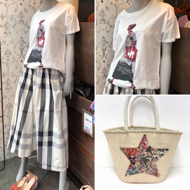 グラフィカルな女の子のプリントがお洒落なコットン素材のトップス💕と、チェックスカート トのコーデはいかがでしょうか?