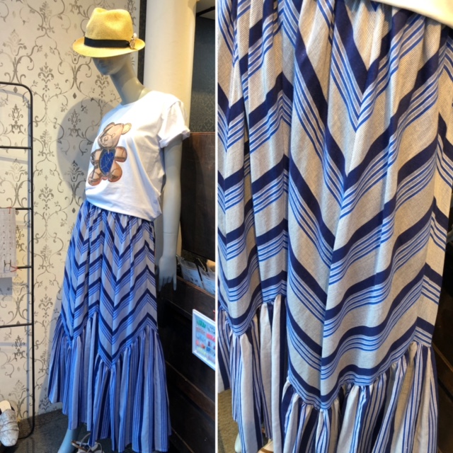 くまちゃんTシャツとストライプのスカート💕 キラキラと光るビジュークマちゃんTシャツを爽やかなストライプのデザインスカートでコーディネートしてみました💕 胸にワンポイントのテイシャツは、柄物スカートと合わせてもスッキリと合いますよん💕 明日から一番再値下げ💕💕💕で販売いたします 掘り出し物を探しにいらしてくださいませねーー Tシャツ ¥5500💕 スカート ¥9856💕😍 帽子 ¥3190 2021年7月10日