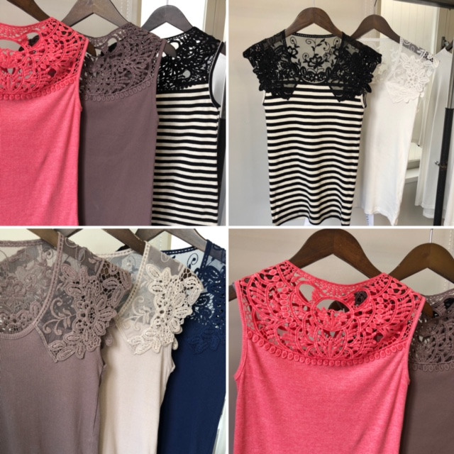 レースのタンクトップ💕¥4950 大人気のデコルテレースのタンクトップ2型に、新色のチェリーピンク、モカブラウン、や白❎黒のボーダーが仲間入りしました💕 限定数で今週末に入荷予定となっております💕 とっても着やすいから、色違いで欲しくなっちゃいますよぉ〜 ブラックやカーキもご用意しております 2021年7月13日
