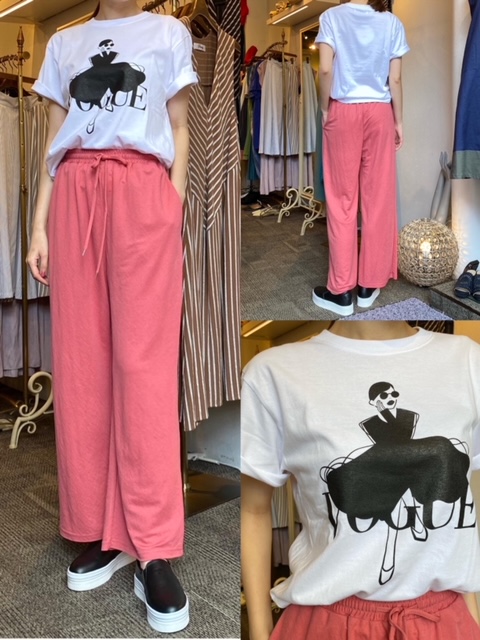 Tシャツ¥5390 パンツ¥6600✨ VOGUEのデザインが印象的なTシャツに、ウエストゴムでシルエットが綺麗な楽ちんパンツ✨✨ パンツはベーシックなカラーもございますので、気になる方はお早めにお問い合わせくださいませ😊 Tシャツ¥5390 パンツ¥6600 2021年7月19日