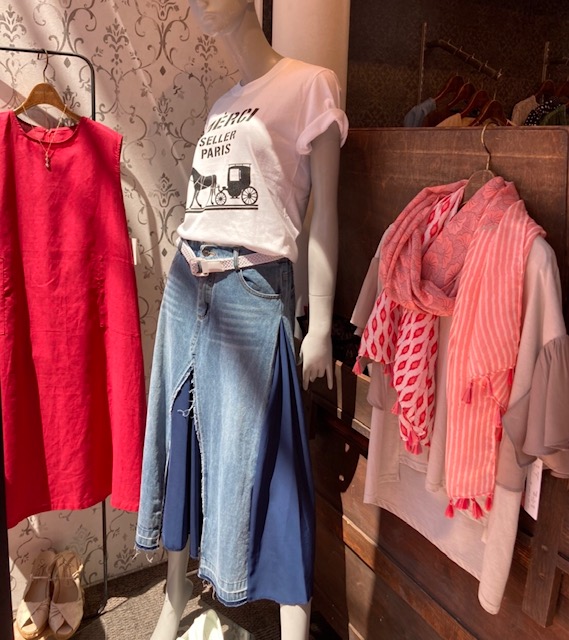 夏の涼しいデザインデニムスカートとロゴTシャツのコーデはいかがでしょうか?💕