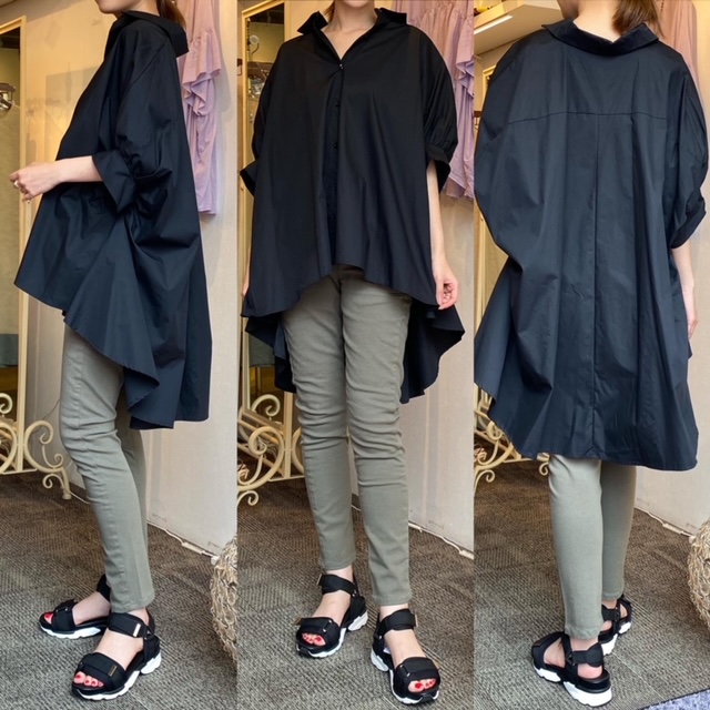 ブラウス¥12100✨ スタッフ一押しアイテム⭐️ トレンドのビッグシルエットブラウスが再入荷しております❣️ ボリュームスリーブが今年らしく 長めのお袖が二の腕をカバーしてくれますよ✨ 夏から秋までロングシーズン着ていただける一枚です💕 ブラウス¥12100 パンツ¥15180 サンダル¥9350 2021年7月26日