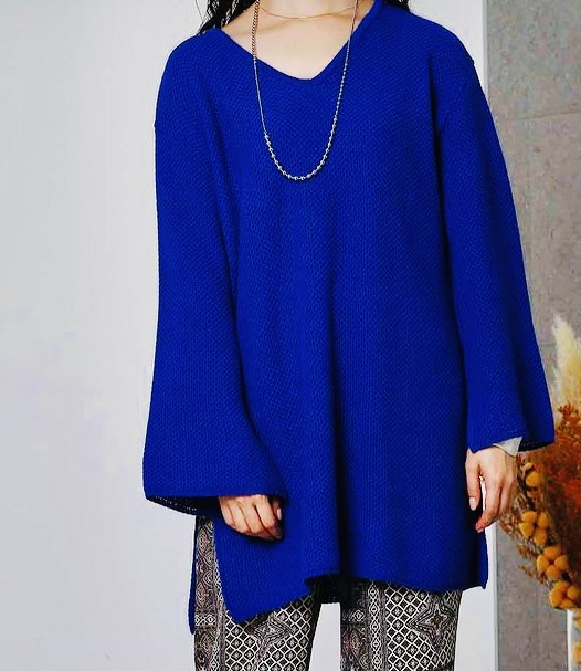 サイドスリットニット💕 秋1番に映える落ち着いた深いブルーのニットが到着しました💕 ニット専門の老舗メーカーの自信作⭐️⭐️⭐️ チクチクしないしなやかな糸で編まれており、春先まで大活躍してくれそうです😃 冬になるとなかなか見つからないカラーなので気になる方はお早めにーー Vネックチュニックニット ¥14300💕 フリーサイズ 身幅 112cm 着丈 69cm お色違いはブラウンがございます 2021年8月29日