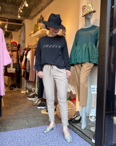 ストレッチテーパードパンツ💕 ハイテンションの素材で出来たテーパードパンツと、とろみ素材のロゴトップスのコーデはいかがでしょうか? カジュアル過ぎない適度なフェミニン具合がちょうど良い⭐️ トップスはお色違いにカーキ色がございます💕 パンツはブラックがございます💕 秋のお帽子も沢山入荷いたしました💕 トップス ¥9790 パンツ ¥14300 シューズ ¥6490 2021年8月30日