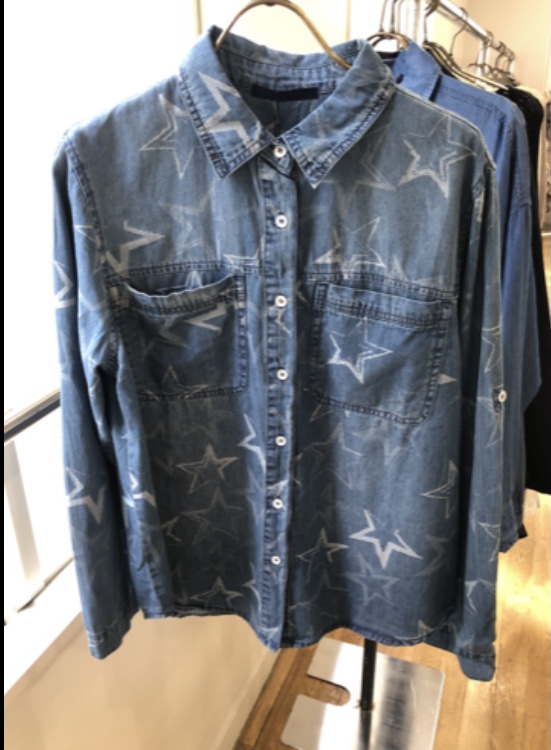 星のデザインデニムシャツ💕 手書き風に仕上げた星のデザインシャツはいかがでしょうか?💕 洗いをかけて、こなれた雰囲気に仕上げたソフトデニムで着心地GOOD⭐️⭐️⭐️ 秋の初めはワンピースの羽織として、冬になったらざっくりとしたニットを重ねたりして、、 かなり使えるシャツです 少しコンパクトなサイズ感です 星のモチーフシャツ ¥12100💕💕💕 2021年8月10日