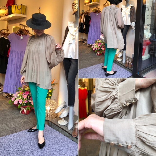 アンティーク風なカラーがお洒落なシフォンブラウスはたっぷりとしたお袖のボリュームやスタンドネックに加えて、マットなゴールドのボタンがGOODな一枚💕💕💕 今年らしくカラーパンツで合わせたコーデはいかがでしょうか?