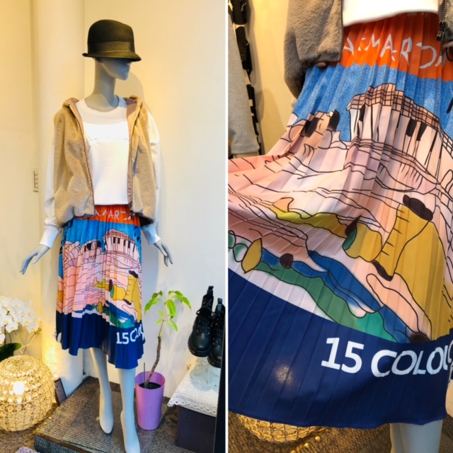 風景画のプリーツスカート💕¥9350 ヨーロッパの絵画のような風景画をプリントしたプリーツスカートをスポーティーなトップスとフェイクムートンのフードベストでコーディネートしてみました💕 ベストは今月後半に入荷予定のアイテムです😃 上質なフェイクムートンのフードベストは、ハイネックのインナーが付いて10890円なのですーーーー アイボリー、ベージュ、グレー、ネイビー、ブラックで入荷いたします😃 華やかでスポーティーなコーディネートです💕💕💕 トップス ¥10890 ファーベスト タートルセット ¥10890 2021年9月5日