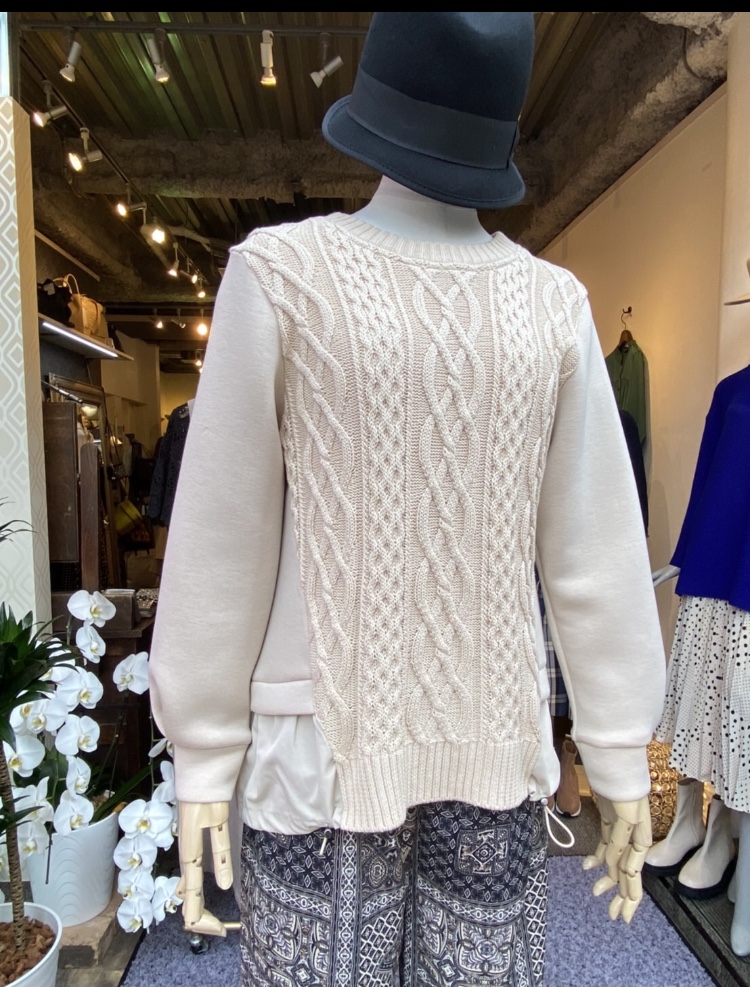 デザイントップス💕 秋からすぐに着られる軽いニットとポンチ素材のドッキングプルオーバー が入荷しました💕 ニットはコットンとアクリルの混紡素材で毛玉になりにくく、春先4月くらいまでは大活躍します💕 もちろんホームクリーニングOK🙆♀️です めちゃ着やすいので、ぜひ一枚いかがでしょうか? デザイントップス ¥12100💕 2021年9月7日