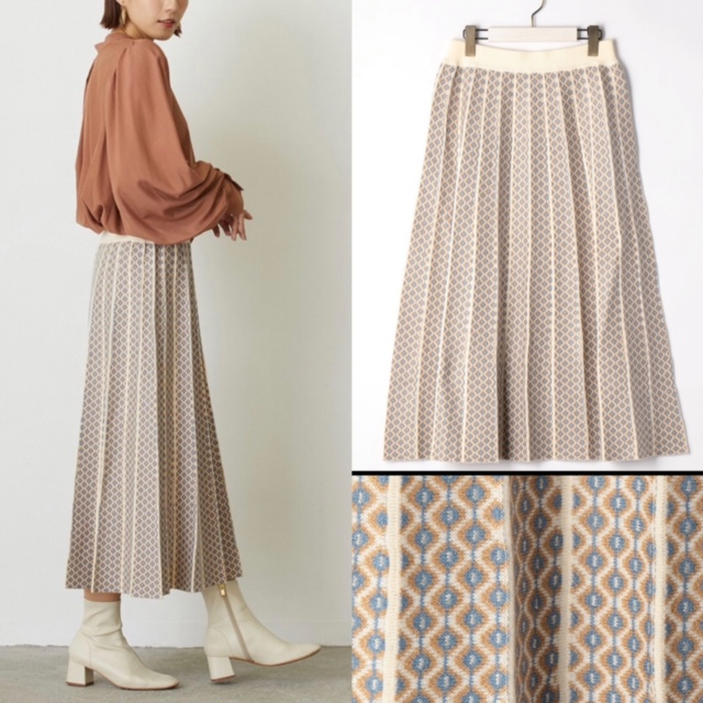 ニットジャガードスカート💕 アイボリー地 にキャメルとサックスブルー のジャガード柄が素敵なニットスカートが到着しております💕 ウェストはソフトゴム仕様で、軽い履き心地💕 冬にも映える明るいカラーが魅力的⭐️⭐️⭐️ ミドルの着丈も嬉しい一着です スカート ¥6490💕 ウェスト 64cm ヒップ101cm 着丈 77.5cm 2021年9月10日