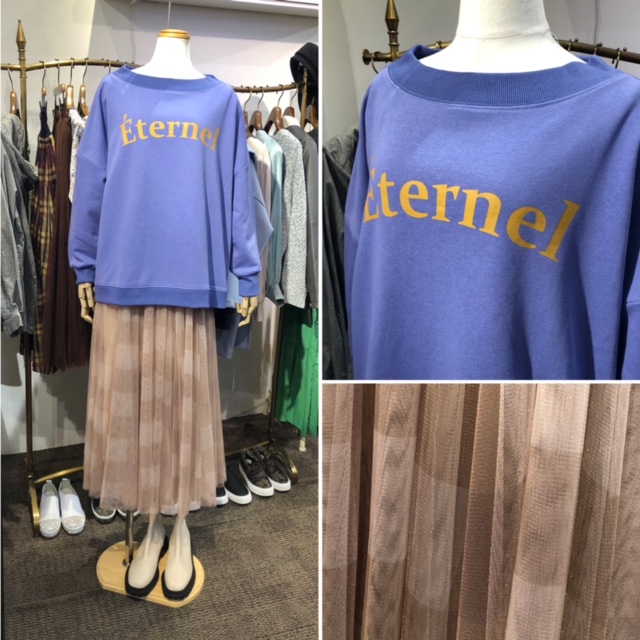 パープルのトップス ¥6490💕 コットンのスウェット素材で出来た、デザインプルオーバー が到着しました💕 少し広めのネックと爽やかなパープルにベージュの文字がポイント⭐️ 秋のお出かけに写真映えしそうな一着です お色違いは、チャコールグレーとオフ白がございます トップス ¥6490 スカート ¥14300 2021年9月10日