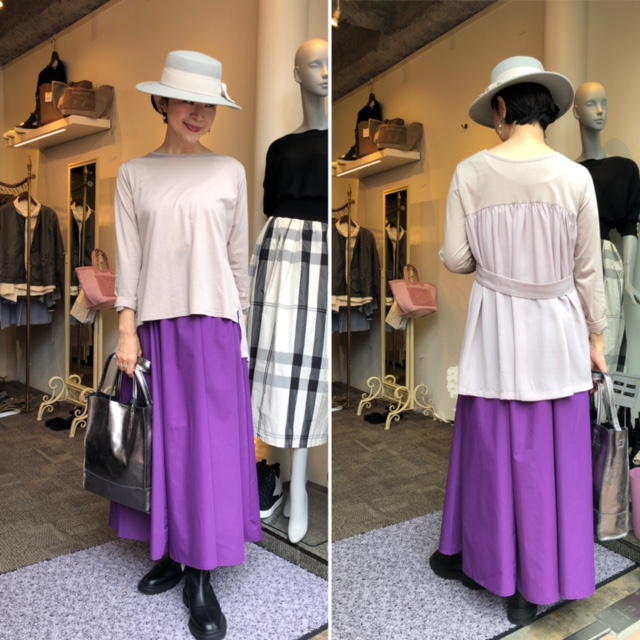 デザイントップス ¥5390 バイオシルケット加工のコットンとポリエステルシフォンをドッキングしたお洒落なデザイントップスが、5390円 お色違いは白とブラックがございます。 一枚でサラッと着られて使い回し度120%💕💕💕 スカート ¥8690‼️ ブーツ ¥14300💕 2021年9月11日
