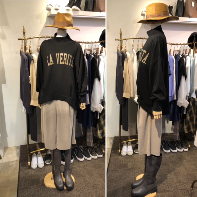 ロゴプルオーバー ¥4950💕 ソフトなスウェット素材のデザインプルオーバーとキュロットパンツのコーディネートはいかがでしょうか? ヒップが隠れる、バックテールのトップスは、どんなボトムスにも合わせやすくて、めちゃ便利なアイテム💕 ブラック、グレー、モカブラウンの3カラーで入荷しました😃 キュロットパンツは、バックウェストゴム仕様で、とっても楽チンな履き心地です⭐️⭐️⭐️ しなやかでマットな艶のあるコーデュロイ素材です トップス ¥4950 パンツ ¥10780 帽子 ¥8690 ブーツ ¥13200 2021年9月12日