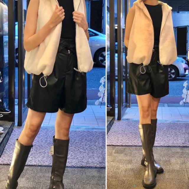 エコレザーのショートパンツ💕¥16280 美脚&小尻シルエットのエコレザーのショートパンツが再入荷いたしました💕 今期も大人気のファーベストを羽織れば、カジュアルもラグジュアリーな雰囲気になります⭐️⭐️⭐️ ファーベストも、アイボリー 、ブラック、ネイビー、ベージュ、グレーの5カラーで展開しております ハイネックインナー付きで¥10890は破格なのでお見逃しなく💕💕💕 グレーのロングブーツ ¥13200 2021年9月24日