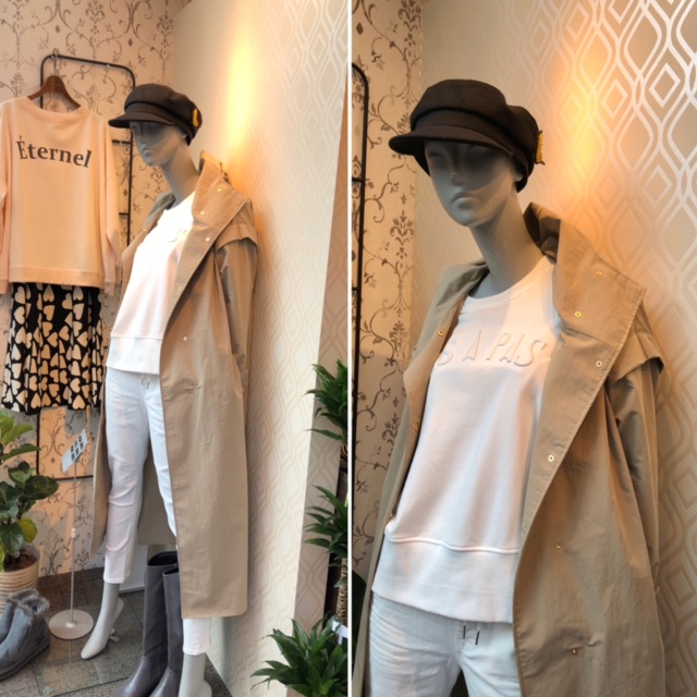 フードコート💕¥17380 スタンドネックと大きめのフード💕サイドスリットと少しだけ丸みを帯びたコクーンシルエットがめちゃお洒落なコートを白のパンツとトップスで合わせてみました💕 こちらはウインドー用のディスプレイなので、カラーで合わせてみましたが実際には、パンツをデニムに変えたり、黒パン、カラーパンツなどを取り入れると良いと思います💕😍 薄手のスウェットトップスは秋から春まで大活躍してくれます💕 着丈も短めなので、スカートやワイドパンツ にも好相性ですよーーー お色違いはブラックがございます トップス ¥10890 コート ¥17380 帽子 ¥5390 2021年9月24日