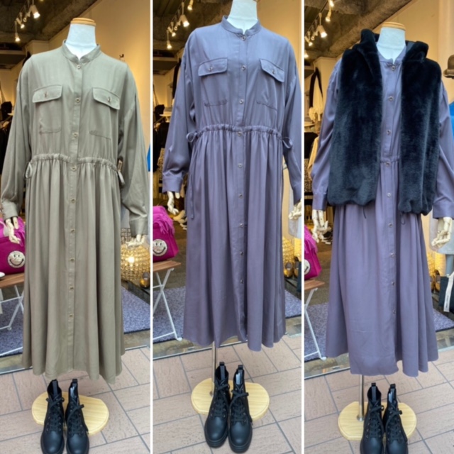 ワンピース💕7590 ポリエステル素材のとろみワンピースが到着しました💕 長袖でウェスト部分に紐があり、ウエストをシュッと結んで着丈を調整可能です⭐️⭐️⭐️ 今すぐ着られて、とっても便利な一着です。 ファーベストインナー付きで¥10890 2021年9月25日