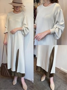 ワンピース¥12100 プリーツワイドパンツ¥12980✨ 深めのスリットが今っぽいニットのロングワンピースに、プリーツワイドパンツをコーディネートしてみました✨ ブラウンをアクセントにした 秋らしいベージュコーデです😊💕 ワンピース¥12100 プリーツワイドパンツ¥12980 2021年9月28日