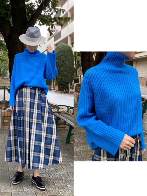 ニット¥11000 スカート¥16280✨ 鮮やかなブルーが目をひく 太リブカラーニット💙 すっきりとしたシルエットです✨ そして大人気のチェックスカート😊 ポリエステル100%でお手入れも簡単です✨ ニット¥11000 スカート¥16280 2021年10月1日
