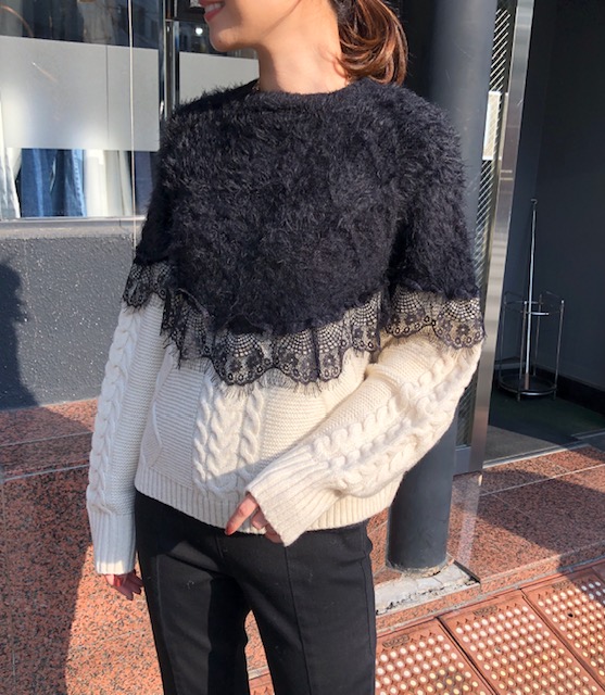配色レース切り替えニット💕 ケーブル編み❎シャギーニット❎レースが繊細なニットが到着しました💕 非ウール素材で毛玉になりにくいから、いつまでも綺麗に着ていただけます⭐️⭐️⭐️ 今季デザイン性の高いニットは注目アイテムです ぜひお一つ新調させれませんか? 配色切り替えニット ¥16500💕 明日から10月3日日曜日まで、ブログを見てご注文のお客様には、10%オフ‼️ で販売させて頂きます ぜひこの機会にご注文下さいませね。 2021年10月1日