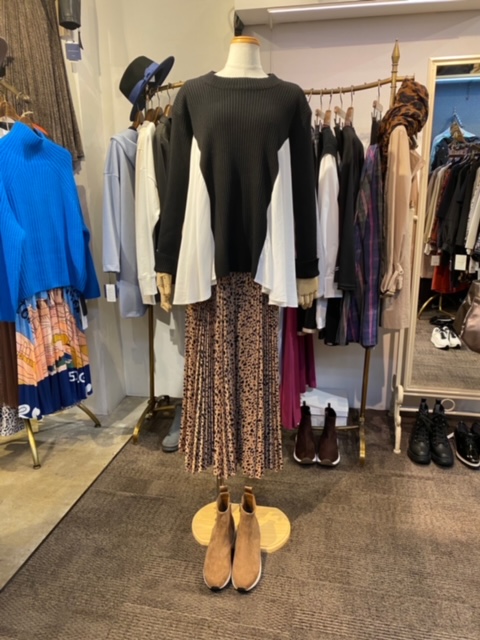 ニットドッキングプルオーバー💕¥7590 非ウール素材のリブニットとテロンとした布帛の生地を組み合わせたデザイントップスが到着しました💕 他では見つからないプチプラで、ハイクオリティなデザインです⭐️⭐️⭐️ ブラック、グレー、ベージュ の3カラーで入荷しております 適度な厚みで、春先まで大活躍出来そうです デザイントップス ¥7590💕 プリーツワイドパンツ ¥12980 ブーツ ¥11000💕💕💕 ブーツは、ベージュの他にブラックもございます 2021年10月3日