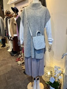 アルパカ混紡ニットベスト💕 ふわふわのアルパカ糸を80%以上で編んだ、上質なチュニックベストが到着しました😍 高さのあるネックラインとサイドスリットデザインが旬の着こなしをサポートしてくれます💕 今回はグレージュの新作プリーツスカートを合わせたスタイリングにしてみました。 スカートは総ゴムでとても履きやすいです💕 小柄な方にもお薦めのスタイリングです ニット ¥13200 スカート ¥4290 バック ¥3630 ブーツ ¥9900 2021年10月9日