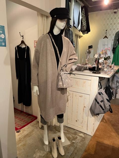 ノーカラーコート💕¥15290 ウール調の生地感が高見えしてくれる💕軽量のノーカラーコートが入荷しております 今から冬の立ち上がりまで着られて春先もかなりお役に立てそうなコートです💕😃 ベージュの他にお色違いはブラック、アイボリー、サックスブルー などで展開しております💕⭐️ とっても軽くて肩が凝らないですよ⭐️⭐️⭐️ パイソンバック ¥8690💕 白いブーツ ¥9900 2021年10月13日