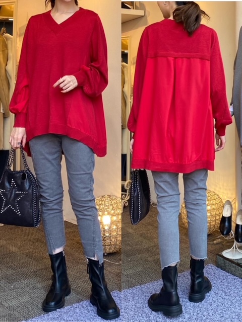ニット¥14,300 デニム¥14,300✨ ビビットなラッドの異素材MIXニットはいかがでしょうか❣️❣️ サイドと後ろが異素材のドッキングになっていてお洒落ですよ✨ レッドは意外と合わせやすいカラーが多いので、カラーものに挑戦したい方にもおすすめです✨✨ ニット¥14,300 デニム¥14,300 2021年10月16日