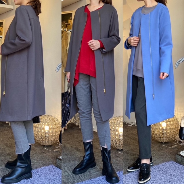 コート¥19580✨ レッドにもよく合うチャコールグレーのコートは、ノーカラーで首元すっきり✨ スポーティーに着ていただけます! お色違いでブルーもございます😊✨ コート:ポリエステル76%レーヨン18%ポリウレタン6% コート¥19580 2021年10月16日