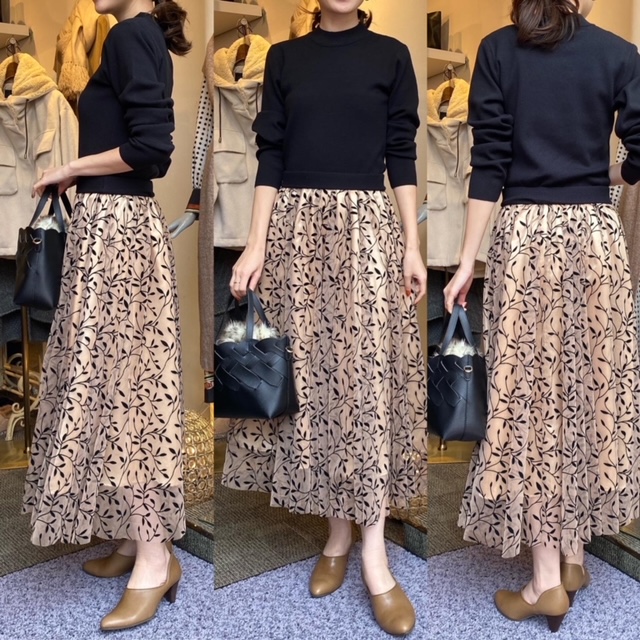 ドッキングワンピース¥18150✨ 大好評をいただいているドッキングワンピースのご紹介です🧡 ニットとチュールのドッキングで、スカートの刺繍が上品で素敵ですよ✨ おすすめです💕 ドッキングワンピース¥18150 2021年10月26日