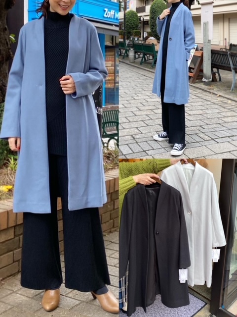 ノーカラーコート¥25,300✨ 首元すっきりなノーカラーコート✨✨ 中にフードを着てカジュアルダウンしても素敵です💕 ブルーの他に、ブラックとアイボリーがございます❣️ アクリル58%ポリエステル42% ¥25,300 2021年10月27日