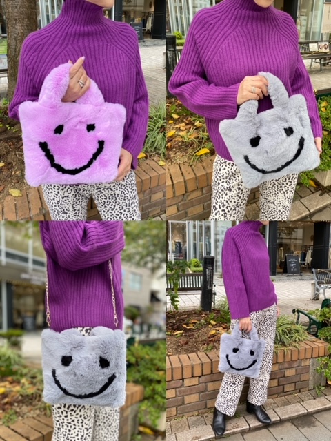 バッグ¥7500✨ キュートなニコちゃんマークのファーバッグ💕 コーデのポイントにおすすめなパープルと、どんな服装にも合わせやすいグレー✨✨ どちらもおすすめです💕 バッグ¥7500 2021年10月30日